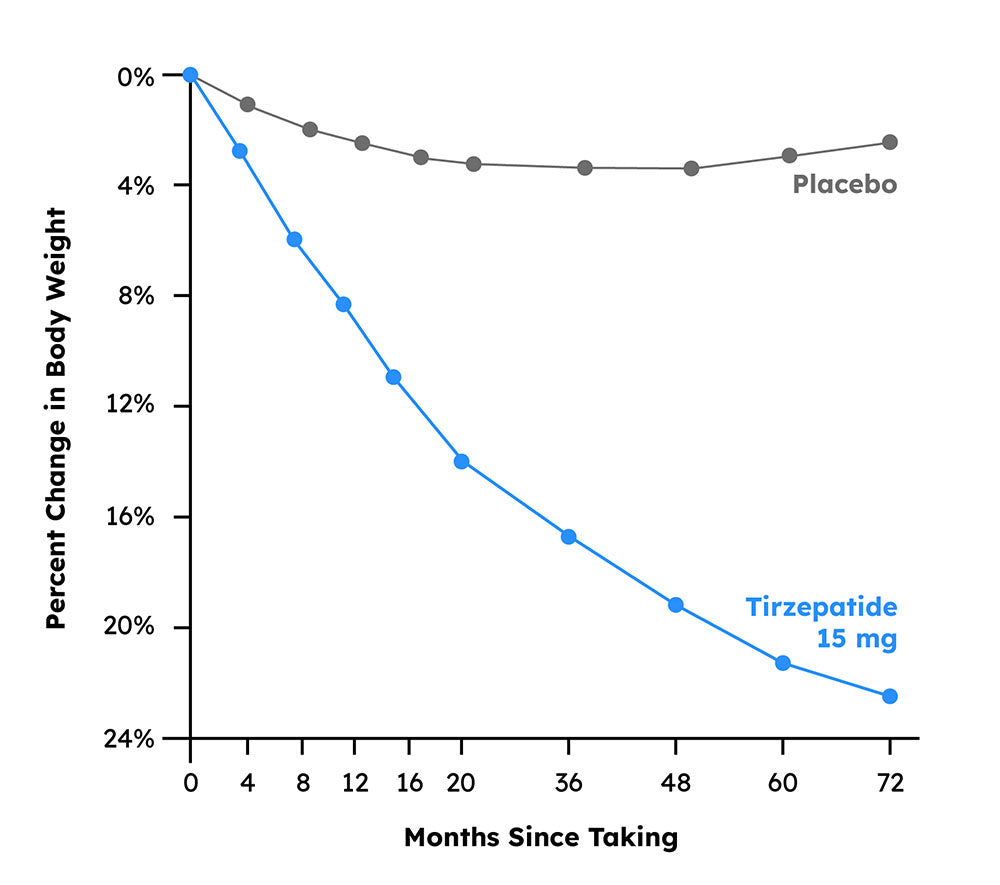 A 2022 study published in the prestigious New England Journal of Medicine showed that taking Tirzepatide for 72 weeks resulted in a 22.5% reduction of body weight. 1